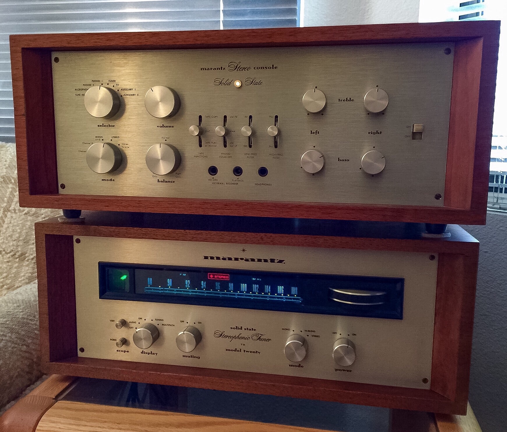 We finally had the Marantz Model 7T, Model 15 and Model 20 checked out. They still meet their factory specifications without the need to recap or replace any part. The rotary controls were cleaned and lubricated. The burned out panel lights were replaced with LED’s. It’s great to see the glow of the 15 again and the sound is sublime. Here are new photos taken June 23, 2016. Tap on the images for full view.